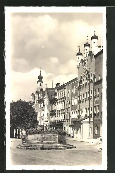 AK Burghausen a. d. Salzach, Teilansicht mit Brunnen
