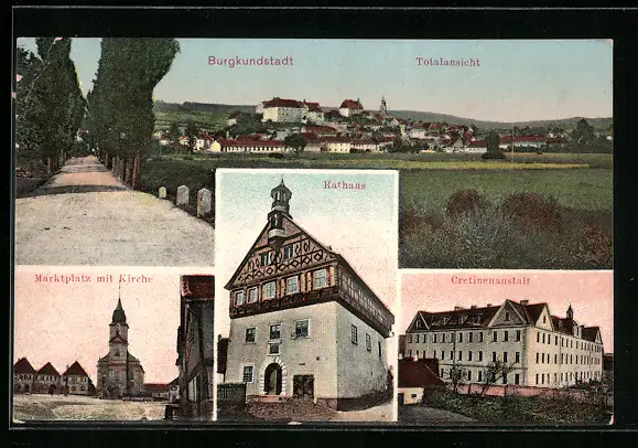 AK Burgkundstadt, Cretinenanstalt, Rathaus, Marktplatz mit Kirche