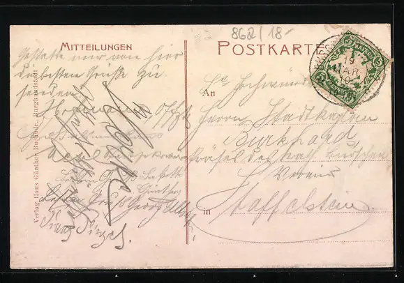 Personenbezogene Daten auf der Rückseite der Karte wurden durch blauen Textmarker unkenntlich gemacht. Die blauen Stellen sind auf die Vorderseite durchgeweicht und wirken sich negativ auf das Postkartenfoto aus