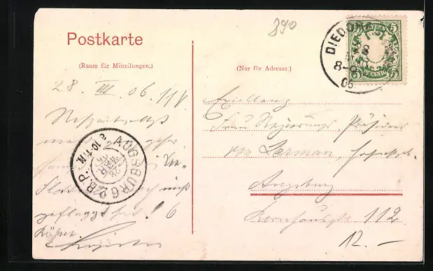 alte Ansichtskarte, gelaufen 1906, Abriebspur Ecke li. oben, Eckschäden li. u. re. oben, guter Zustand