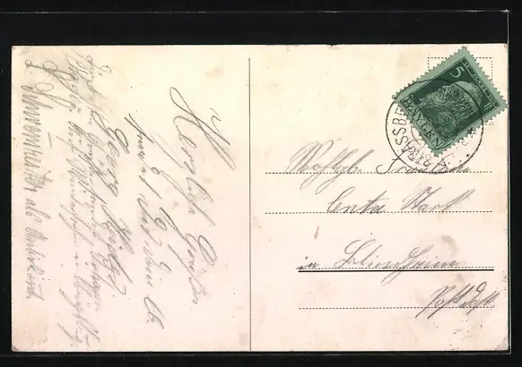 Personenbezogene Daten auf der Rückseite der Karte wurden durch blauen Textmarker unkenntlich gemacht. Die blauen Stellen sind auf die Vorderseite durchgeweicht und wirken sich negativ auf das Postkartenfoto aus