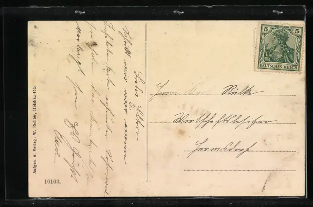Personenbezogene Daten auf der Rückseite der Karte wurden durch blauen Textmarker unkenntlich gemacht. Die blauen Stellen sind auf die Vorderseite durchgeweicht und wirken sich negativ auf das Postkartenfoto aus