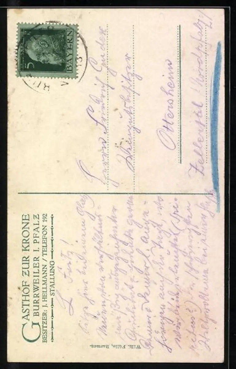 Personenbezogene Daten auf der Rückseite der Karte wurden durch blauen Textmarker unkenntlich gemacht. Die blauen Stellen sind auf die Vorderseite durchgeweicht und wirken sich negativ auf das Postkartenfoto aus
