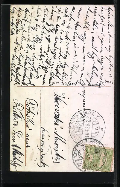 Personenbezogene Daten auf der Rückseite der Karte wurden durch blauen Textmarker unkenntlich gemacht. Die blauen Stellen sind auf die Vorderseite durchgeweicht und wirken sich negativ auf das Postkartenfoto aus