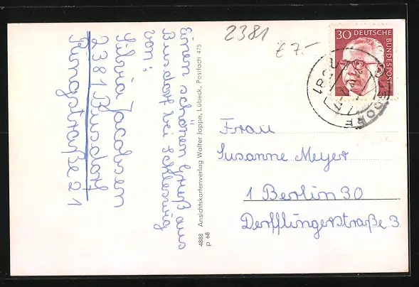 Personenbezogene Daten auf der Rückseite der Karte wurden durch blauen Textmarker unkenntlich gemacht. Die blauen Stellen sind auf die Vorderseite durchgeweicht und wirken sich negativ auf das Postkartenfoto aus