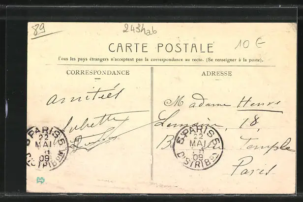 Personenbezogene Daten auf der Rückseite der Karte wurden durch blauen Textmarker unkenntlich gemacht. Die blauen Stellen sind auf die Vorderseite durchgeweicht und wirken sich negativ auf das Postkartenfoto aus