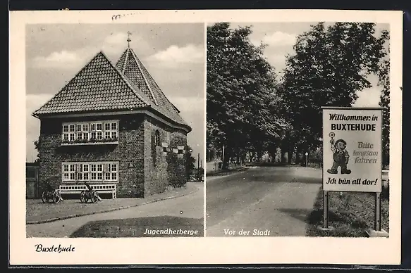 AK Buxtehude, Jugendherberge, Ortsschild vor der Stadt