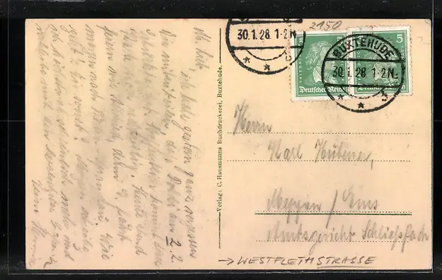 Personenbezogene Daten auf der Rückseite der Karte wurden durch blauen Textmarker unkenntlich gemacht. Die blauen Stellen sind auf die Vorderseite durchgeweicht und wirken sich negativ auf das Postkartenfoto aus