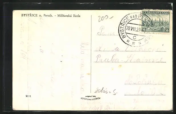 Personenbezogene Daten auf der Rückseite der Karte wurden durch blauen Textmarker unkenntlich gemacht. Die blauen Stellen sind auf die Vorderseite durchgeweicht und wirken sich negativ auf das Postkartenfoto aus