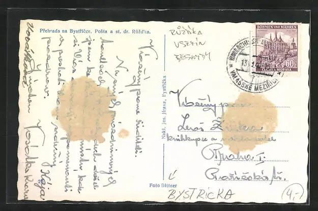 Personenbezogene Daten auf der Rückseite der Karte wurden durch blauen Textmarker unkenntlich gemacht. Die blauen Stellen sind auf die Vorderseite durchgeweicht und wirken sich negativ auf das Postkartenfoto aus