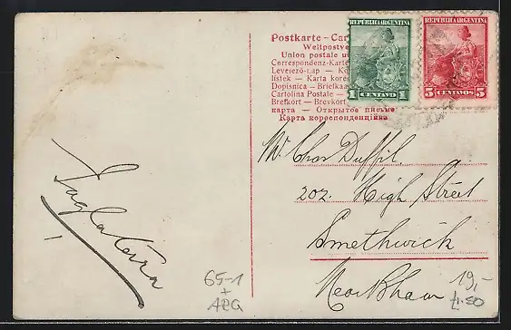Personenbezogene Daten auf der Rückseite der Karte wurden durch blauen Textmarker unkenntlich gemacht. Die blauen Stellen sind auf die Vorderseite durchgeweicht und wirken sich negativ auf das Postkartenfoto aus