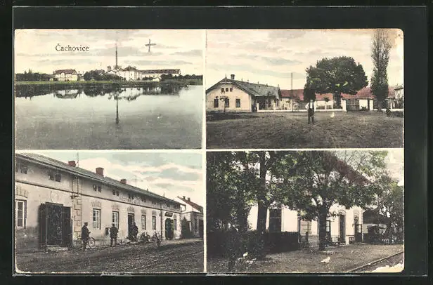 AK Cachovice, Hostinec, Panorama, Strassenpartie
