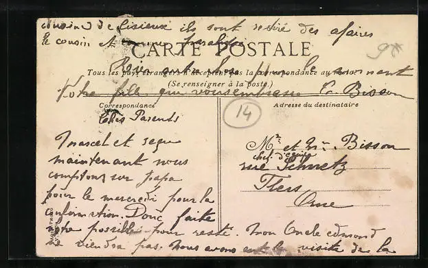 Personenbezogene Daten auf der Rückseite der Karte wurden durch blauen Textmarker unkenntlich gemacht. Die blauen Stellen sind auf die Vorderseite durchgeweicht und wirken sich negativ auf das Postkartenfoto aus