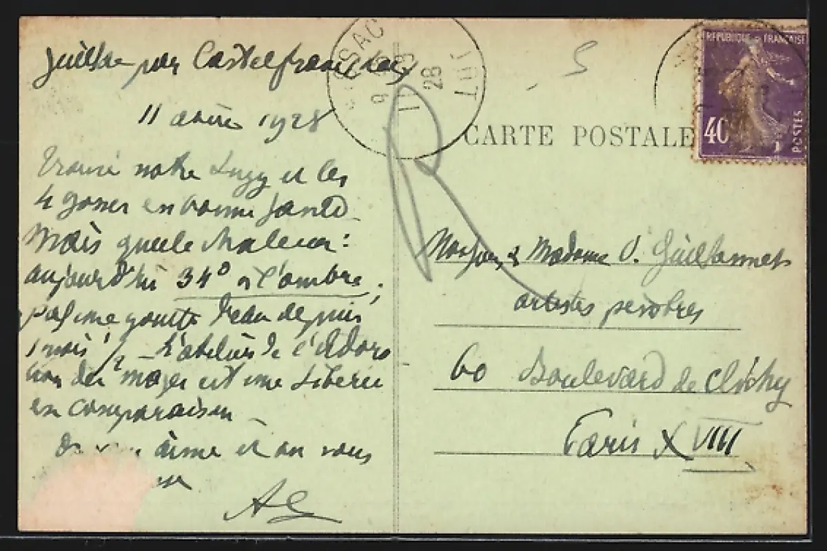 Personenbezogene Daten auf der Rückseite der Karte wurden durch blauen Textmarker unkenntlich gemacht. Die blauen Stellen sind auf die Vorderseite durchgeweicht und wirken sich negativ auf das Postkartenfoto aus