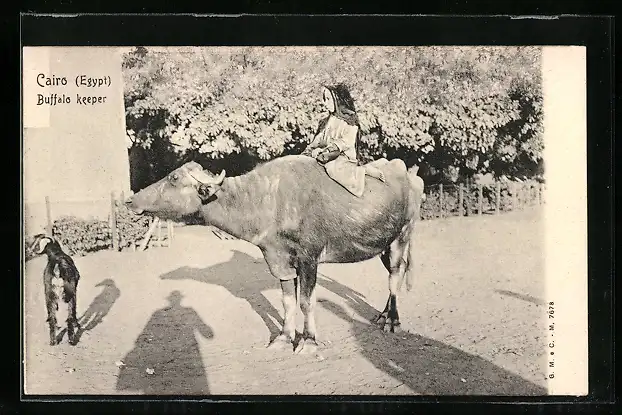 AK Cairo, Buffalo keeper, Junges Mädchen auf einem Büffel