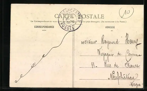 Personenbezogene Daten auf der Rückseite der Karte wurden durch blauen Textmarker unkenntlich gemacht. Die blauen Stellen sind auf die Vorderseite durchgeweicht und wirken sich negativ auf das Postkartenfoto aus