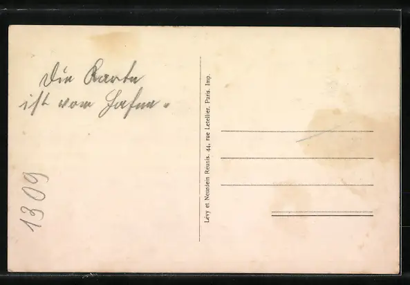 Personenbezogene Daten auf der Rückseite der Karte wurden durch blauen Textmarker unkenntlich gemacht. Die blauen Stellen sind auf die Vorderseite durchgeweicht und wirken sich negativ auf das Postkartenfoto aus