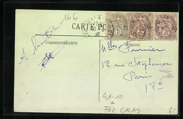 Personenbezogene Daten auf der Rückseite der Karte wurden durch blauen Textmarker unkenntlich gemacht. Die blauen Stellen sind auf die Vorderseite durchgeweicht und wirken sich negativ auf das Postkartenfoto aus