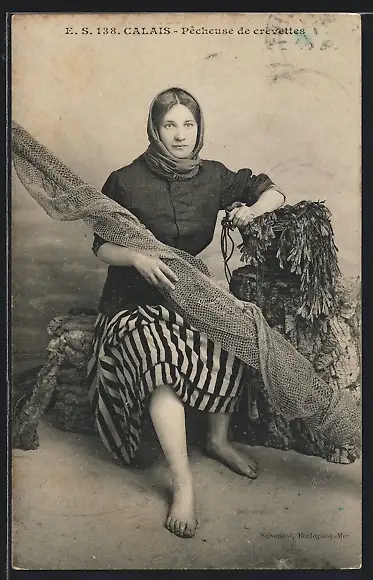 AK Calais, Pêcheuse de crevettes, Frau in Tracht mit Fischernetz