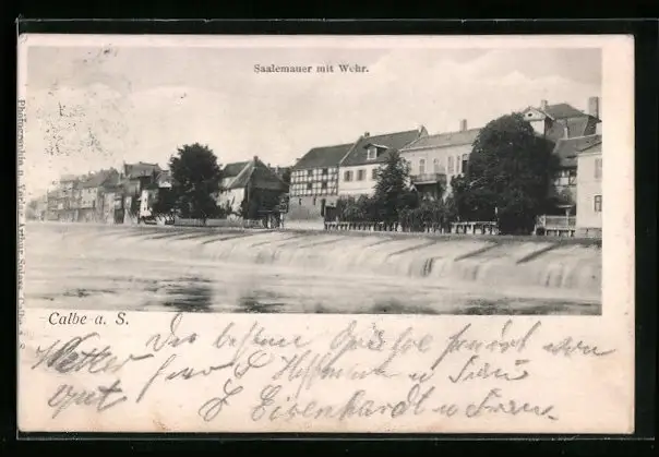 AK Calbe a. S., Saalemauer mit Wehr, vom Wasser gesehen