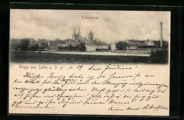 AK Calbe a. S., Totalansicht mit Fabrikschlot
