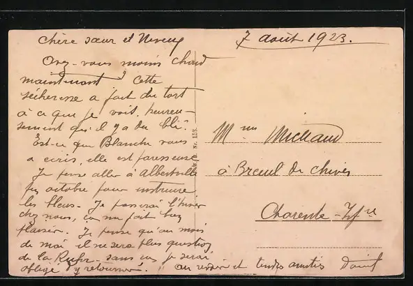 Personenbezogene Daten auf der Rückseite der Karte wurden durch blauen Textmarker unkenntlich gemacht. Die blauen Stellen sind auf die Vorderseite durchgeweicht und wirken sich negativ auf das Postkartenfoto aus
