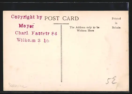 Personenbezogene Daten auf der Rückseite der Karte wurden durch blauen Textmarker unkenntlich gemacht. Die blauen Stellen sind auf die Vorderseite durchgeweicht und wirken sich negativ auf das Postkartenfoto aus