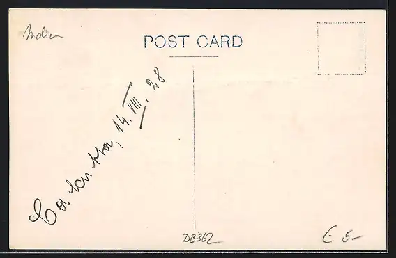 Personenbezogene Daten auf der Rückseite der Karte wurden durch blauen Textmarker unkenntlich gemacht. Die blauen Stellen sind auf die Vorderseite durchgeweicht und wirken sich negativ auf das Postkartenfoto aus