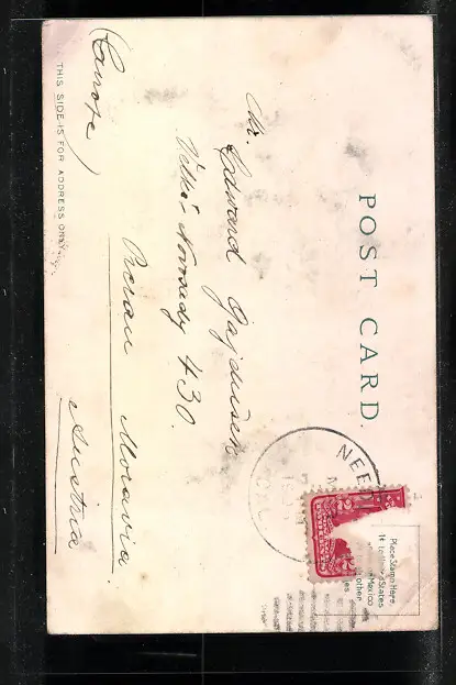 Personenbezogene Daten auf der Rückseite der Karte wurden durch blauen Textmarker unkenntlich gemacht. Die blauen Stellen sind auf die Vorderseite durchgeweicht und wirken sich negativ auf das Postkartenfoto aus