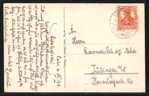 Personenbezogene Daten auf der Rückseite der Karte wurden durch blauen Textmarker unkenntlich gemacht. Die blauen Stellen sind auf die Vorderseite durchgeweicht und wirken sich negativ auf das Postkartenfoto aus