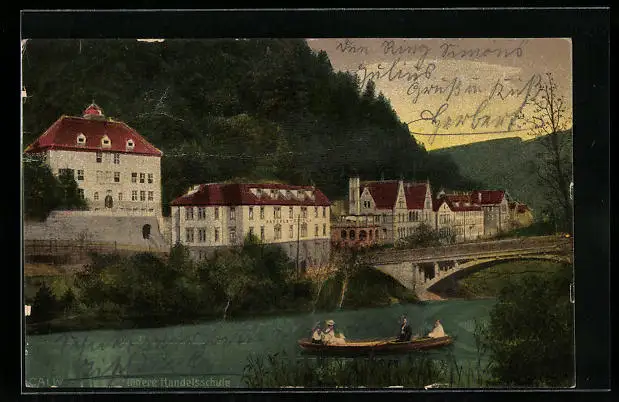 Personenbezogene Daten auf der Rückseite der Karte wurden durch blauen Textmarker unkenntlich gemacht. Die blauen Stellen sind auf die Vorderseite durchgeweicht und wirken sich negativ auf das Postkartenfoto aus