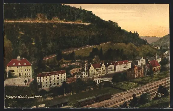 AK Calw, Höhere Handelsschule mit Bahnschienen und Brücke aus der Vogelschau