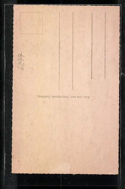 Personenbezogene Daten auf der Rückseite der Karte wurden durch blauen Textmarker unkenntlich gemacht. Die blauen Stellen sind auf die Vorderseite durchgeweicht und wirken sich negativ auf das Postkartenfoto aus