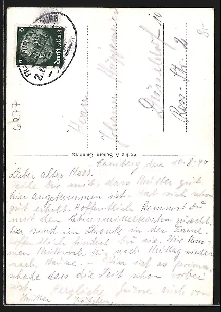 Personenbezogene Daten auf der Rückseite der Karte wurden durch blauen Textmarker unkenntlich gemacht. Die blauen Stellen sind auf die Vorderseite durchgeweicht und wirken sich negativ auf das Postkartenfoto aus