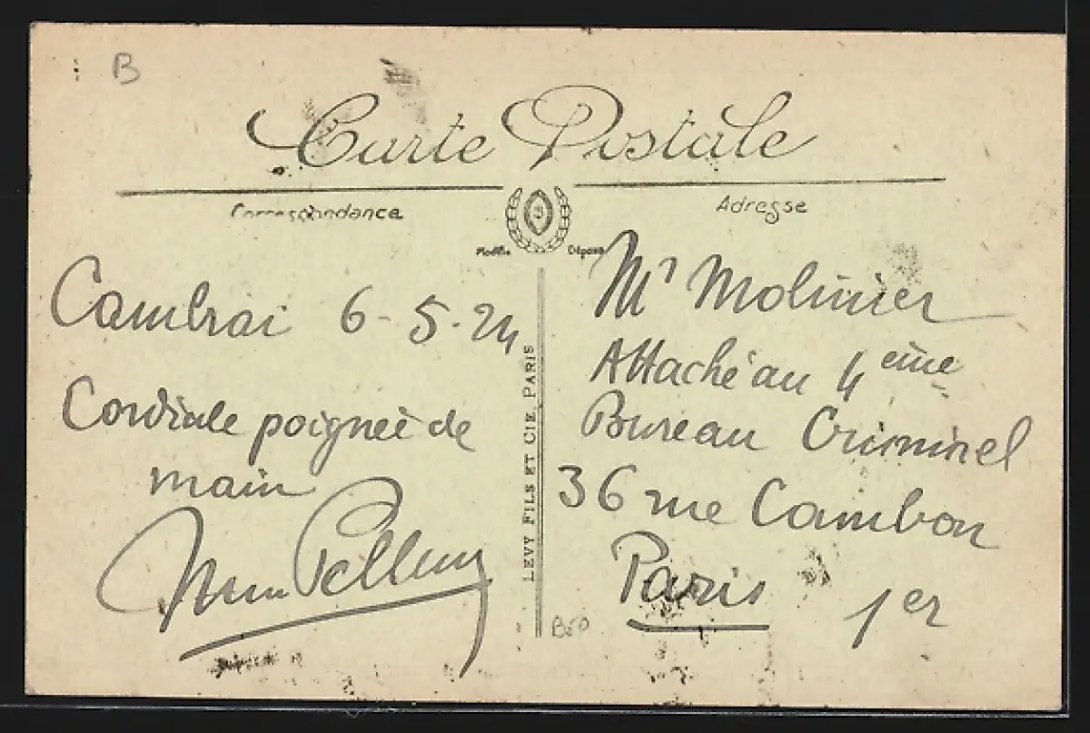 Personenbezogene Daten auf der Rückseite der Karte wurden durch blauen Textmarker unkenntlich gemacht. Die blauen Stellen sind auf die Vorderseite durchgeweicht und wirken sich negativ auf das Postkartenfoto aus