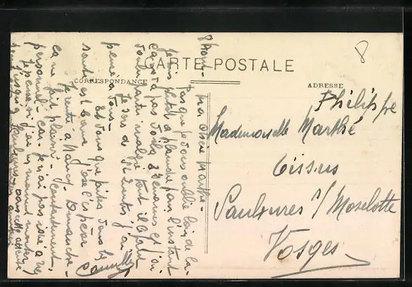 Personenbezogene Daten auf der Rückseite der Karte wurden durch blauen Textmarker unkenntlich gemacht. Die blauen Stellen sind auf die Vorderseite durchgeweicht und wirken sich negativ auf das Postkartenfoto aus