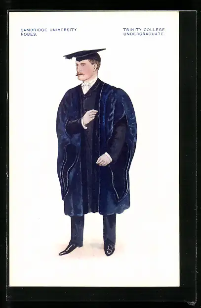 AK Cambridge, University, Robes, Trinity College, Undergraduate, Mann mit Doktorhut und dunkel blauem Umhang