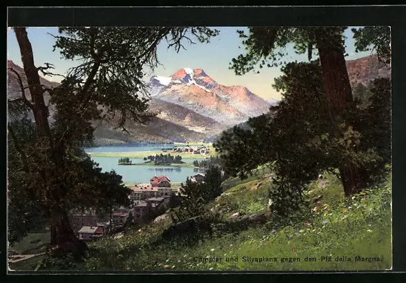AK Campfèr, Totalansicht mit Silvaplana gegen den Piz della Margna