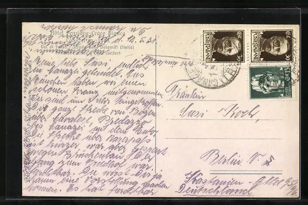 Personenbezogene Daten auf der Rückseite der Karte wurden durch blauen Textmarker unkenntlich gemacht. Die blauen Stellen sind auf die Vorderseite durchgeweicht und wirken sich negativ auf das Postkartenfoto aus