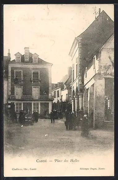 AK Candé, Place des Halles animée avec passants et bâtiments anciens