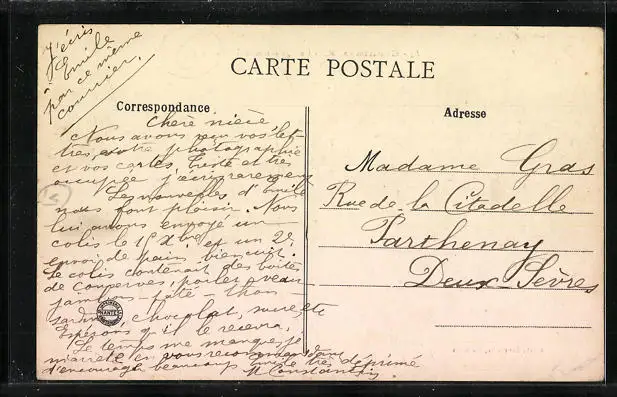 Personenbezogene Daten auf der Rückseite der Karte wurden durch blauen Textmarker unkenntlich gemacht. Die blauen Stellen sind auf die Vorderseite durchgeweicht und wirken sich negativ auf das Postkartenfoto aus