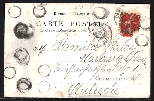 Personenbezogene Daten auf der Rückseite der Karte wurden durch blauen Textmarker unkenntlich gemacht. Die blauen Stellen sind auf die Vorderseite durchgeweicht und wirken sich negativ auf das Postkartenfoto aus