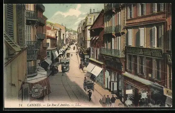 AK Cannes, La Rue d`Antibes, Strassenbahn, Drug Store
