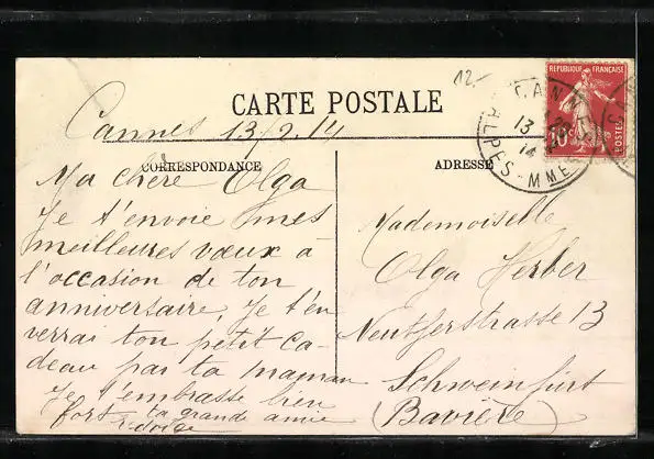 Personenbezogene Daten auf der Rückseite der Karte wurden durch blauen Textmarker unkenntlich gemacht. Die blauen Stellen sind auf die Vorderseite durchgeweicht und wirken sich negativ auf das Postkartenfoto aus