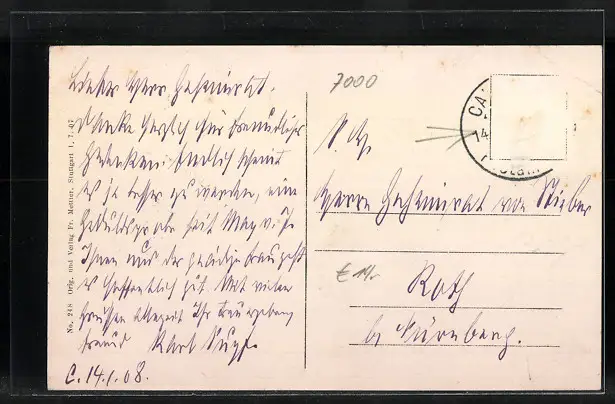 Personenbezogene Daten auf der Rückseite der Karte wurden durch blauen Textmarker unkenntlich gemacht. Die blauen Stellen sind auf die Vorderseite durchgeweicht und wirken sich negativ auf das Postkartenfoto aus