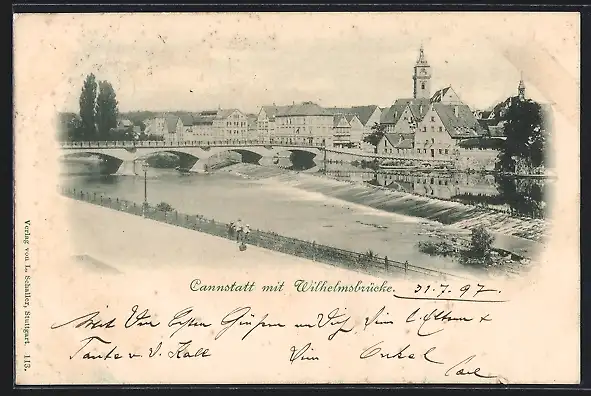 AK Cannstatt, Uferpartie mit Wilhelmsbrücke