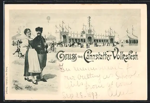 AK Cannstatt, Volksfest, Ehrenpforte und Paar in Tracht