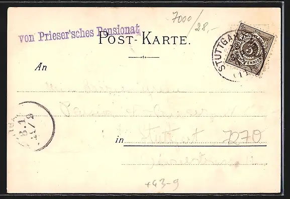 Personenbezogene Daten auf der Rückseite der Karte wurden durch blauen Textmarker unkenntlich gemacht. Die blauen Stellen sind auf die Vorderseite durchgeweicht und wirken sich negativ auf das Postkartenfoto aus