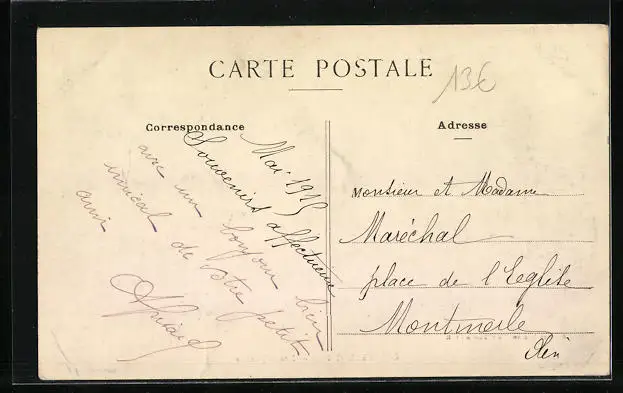 Personenbezogene Daten auf der Rückseite der Karte wurden durch blauen Textmarker unkenntlich gemacht. Die blauen Stellen sind auf die Vorderseite durchgeweicht und wirken sich negativ auf das Postkartenfoto aus