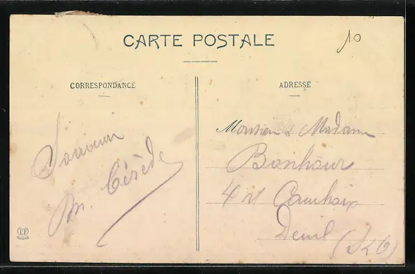 Personenbezogene Daten auf der Rückseite der Karte wurden durch blauen Textmarker unkenntlich gemacht. Die blauen Stellen sind auf die Vorderseite durchgeweicht und wirken sich negativ auf das Postkartenfoto aus